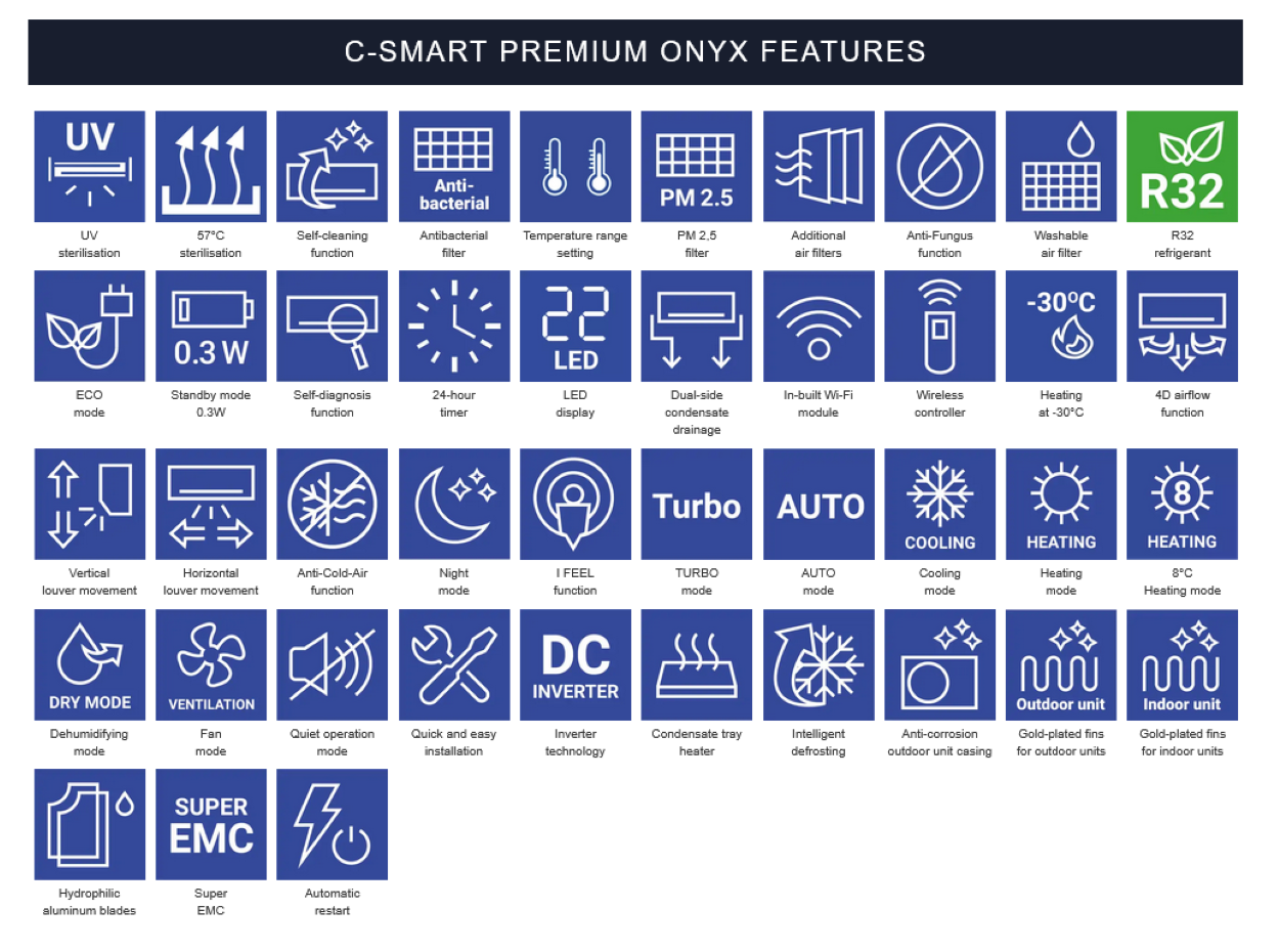 De buitenunit is afgevuld met het meest milieuvriendelijke koudemiddel R32, met dit systeem kunt u koelen, verwarmen tevens ontvochtigen. Het systeem heeft als extra opties GRATIS WIFI en een Luxe Afstandsbediening.